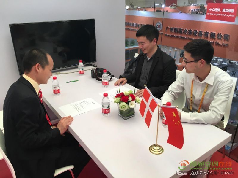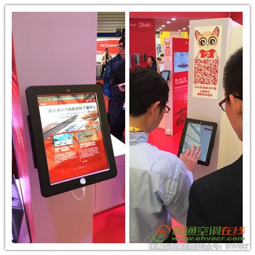 丹佛斯技术专家现场示意全新电子膨胀阀及换热器配套解决方案 互动屏演示了丹佛斯冷水机组解决方案及深入应用其中的丹佛斯制冷元件