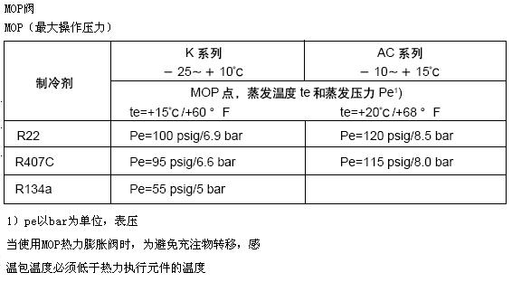 参考资料: 感温包温度:150℃ 阀体温度:120℃ 短时阀体温度:150℃ 工作压力:PB=28bar 试验压力:P'=32bar 泄流能力:15% (可按要求定做) 外平衡管接口:1/4in./6 mm管外钎焊 毛细管长度:TED 3-7.5 1.5m,TED 8-19 1.5m,TED 20-40 3.0m 双向流操作:具有双向平衡流口及用于大范围环境温度条件变化情况下的TDEB阀是为双向流操作而设计的。在反向流动情况下,制冷 能力在试验压力条件下减少15%。带MOP的TD热力膨胀阀不适用于双向流操作